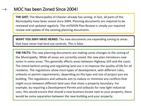 Every resident and property within the Municipality is already in a zoned area. The new plan is not expanding zoning to areas that are un-zoned. While some zones could be changed, we have heard comments that this plan is an expansion of the zoned area, which is a misconception. All parts of the Municipality have zoning and regulations for development which have been in place since 2004. The reVISION Plan Review is a required update to the existing planning documents and an excellent opportunity to address some of the concerns raised by residents over the last 15 years.