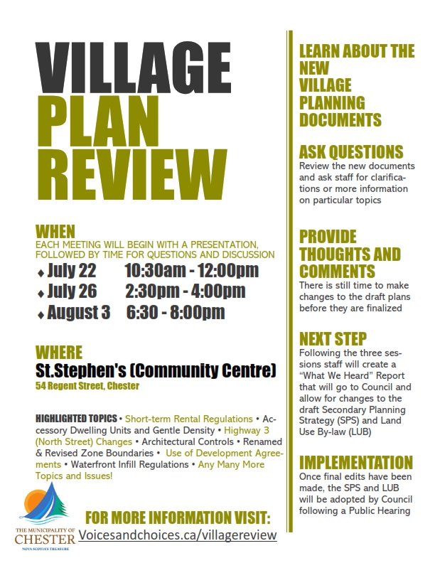 On June 22 Council approved a final engagement schedule to provide information and collect comments and feedback related to the Village Plan Review. In addition to the formal engagement events, members of the public are welcome to reach out to planning staff at any time, by phone (902-275-2599) or email (planning@chester.ca), to provide comments, or request a meeting time to discuss any ideas or concerns in relation to the new planning documents.