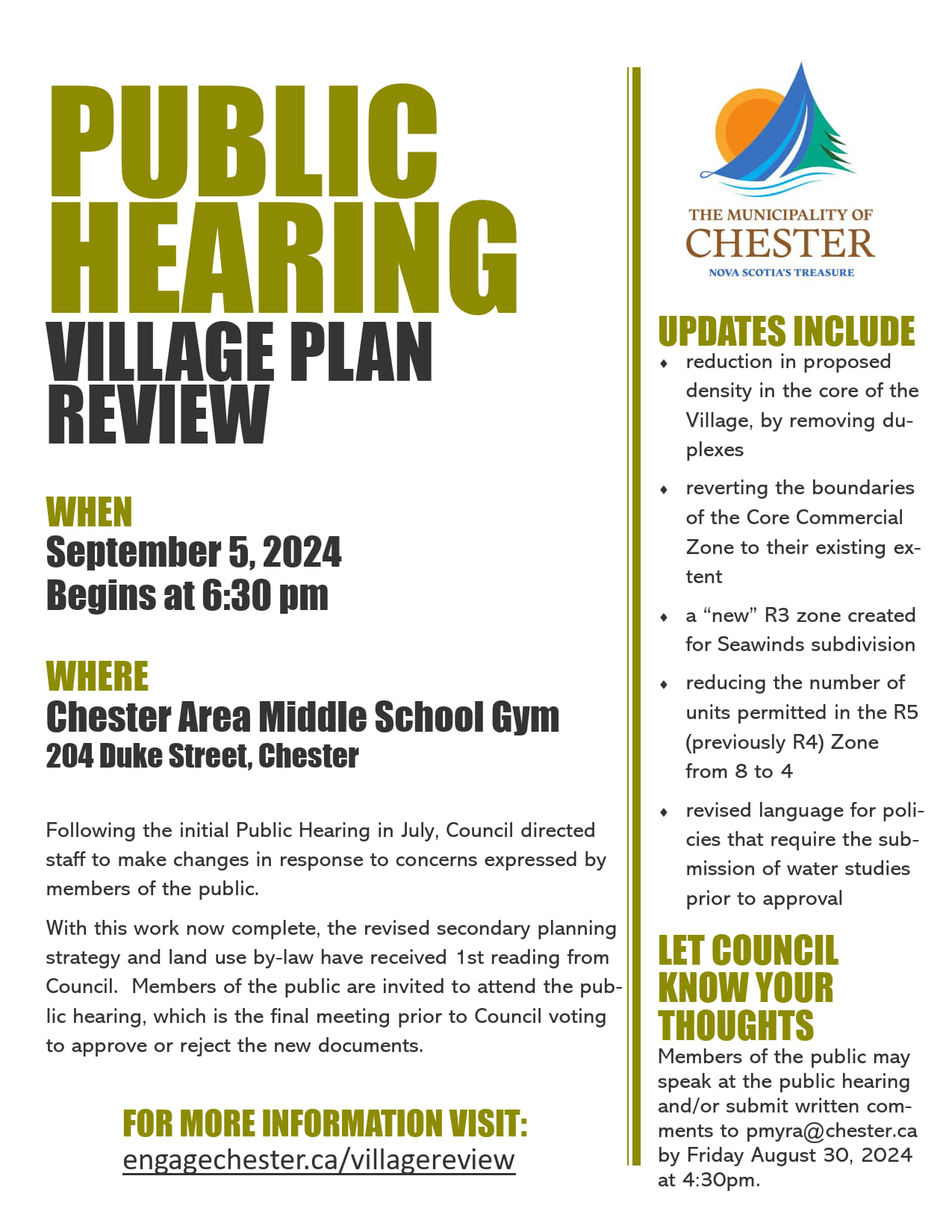 With the above changes, Council again gave 1st Reading to the draft documents at a meeting held on August 8th. A new date for a second Public Hearing has also been set for Thursday September 5th, 2024. The meeting will be held in the gymnasium at the Chester Area Middle School (CAMS), 204 Duke Street, Chester beginning at 6:30pm. Members of the public may speak at the hearing and/or submit written comments to pmyra@chester.ca by Friday August 30, 2024 at 4:30pm.
